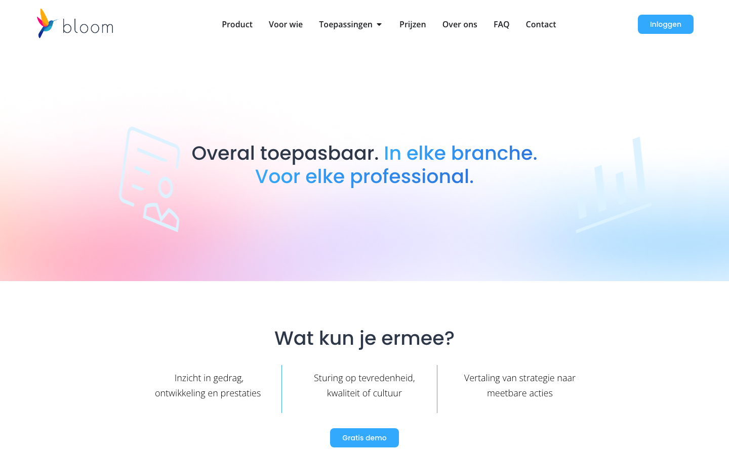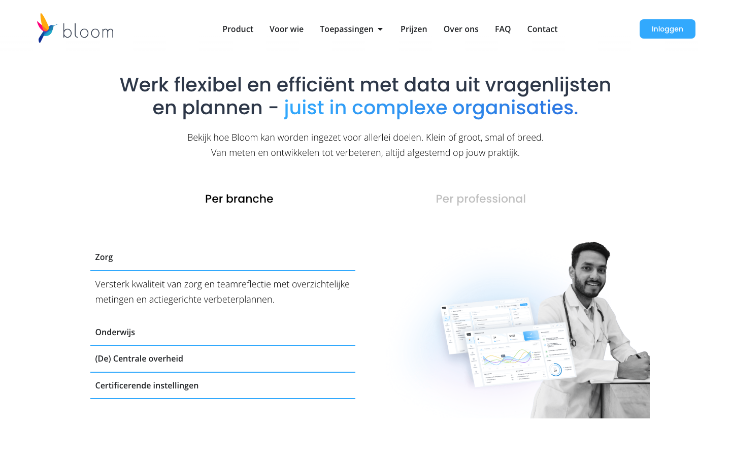 Van zorg en onderwijs tot overheid en HR — Bloom is overal toepasbaar waar datagedreven werken het verschil maakt. Met het platform bouw je aan een cultuur van leren, verbeteren en presteren.